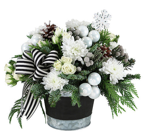Make their dream of a white Christmas come true with this beautiful piece! White mums, ornaments, frosted pinecones and a black and white bow make this arrangement perfect for any holiday decor!