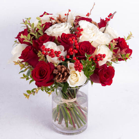 Two dozen red and white roses make a dashing holiday gift, especially when they are arranged with berries and pine cones and delivered in a clear glass vase.