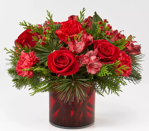 Spread the joy of the season with this merry bouquet of red roses, alstroemeria, carnations, winter greens, and red berries in a glass vase.